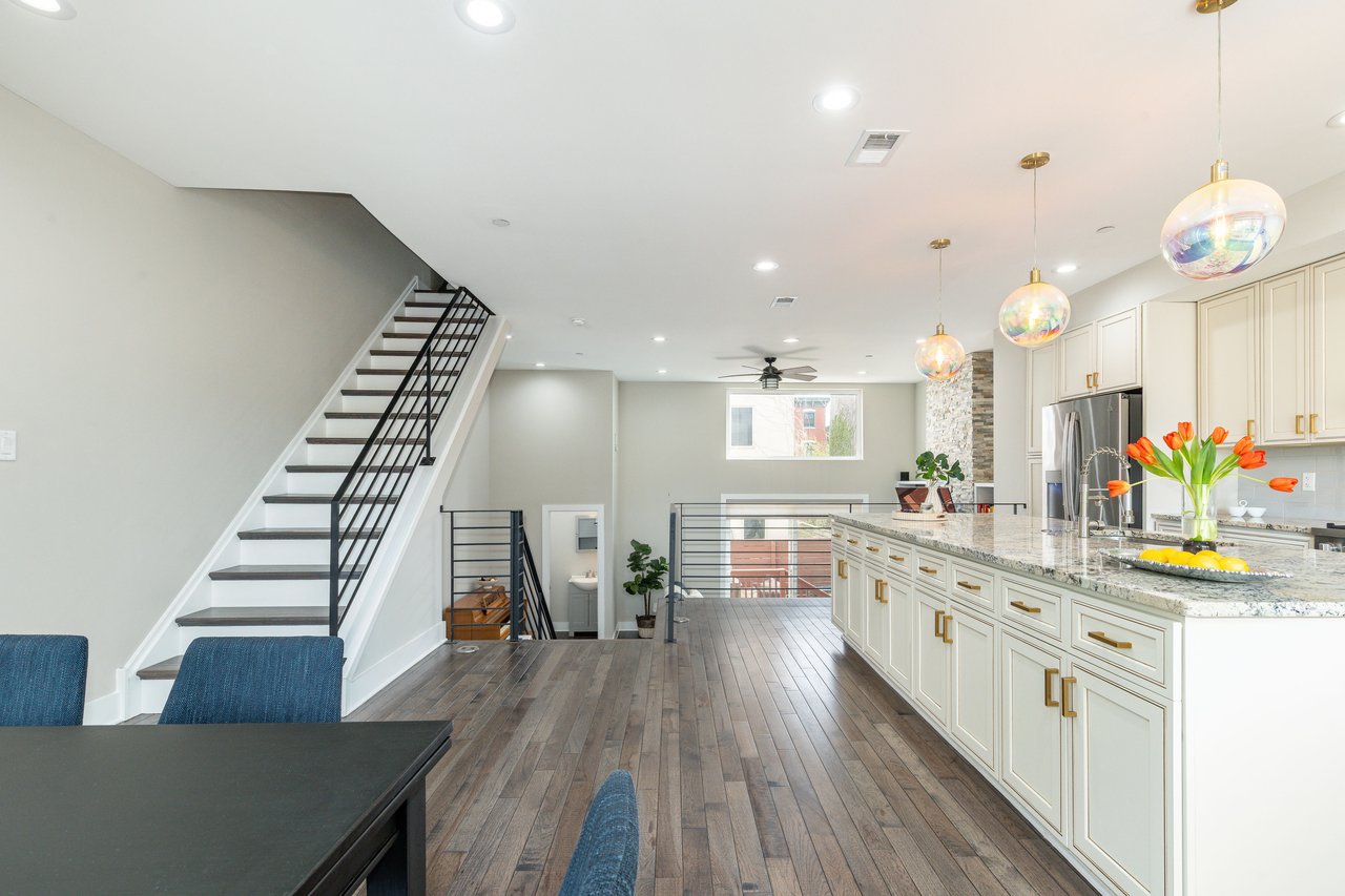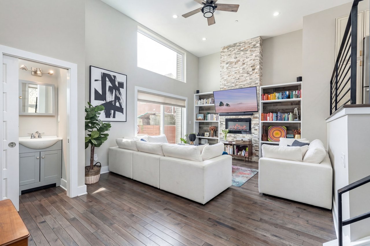 Ascending to the main living level, the home opens into a warm and light-filled living and family room, where soaring 12-foot ceilings and oversized windows create an immediate sense of volume and airiness. A custom-designed fireplace wall serves as a striking focal point, complemented by rich hardwood flooring and a ceiling fan for added comfort. Just off the living space, a private backyard extends the home outdoors, creating a seamless indoor-outdoor flow perfect for entertaining. The kitchen anchors the level with a stunning quartz island complemented by sleek cabinetry and thoughtful design that balances beauty and function. A conveniently located powder room completes the space. Throughout, solid hardwood floors and beautifully crafted custom metalwork add character, texture, and a refined sense of design continuity.