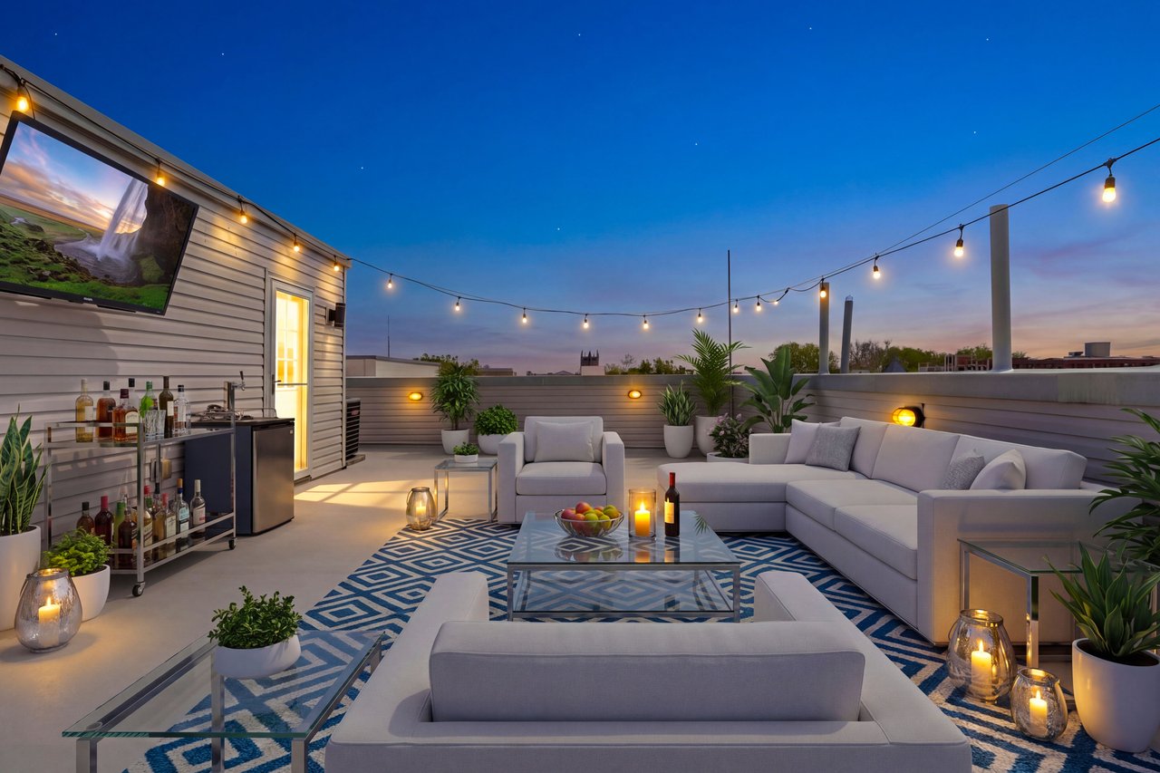 Crowning the home, the rooftop level offers an exceptional outdoor experience. A built-in bar with beverage refrigerator creates the perfect transition to the expansive roof deck beyond—generous in scale and designed for both entertaining and everyday enjoyment. With open sky above and sweeping views of the surrounding neighborhood, the space easily accommodates lounging, dining, and gathering, delivering a rare and elevated outdoor lifestyle.