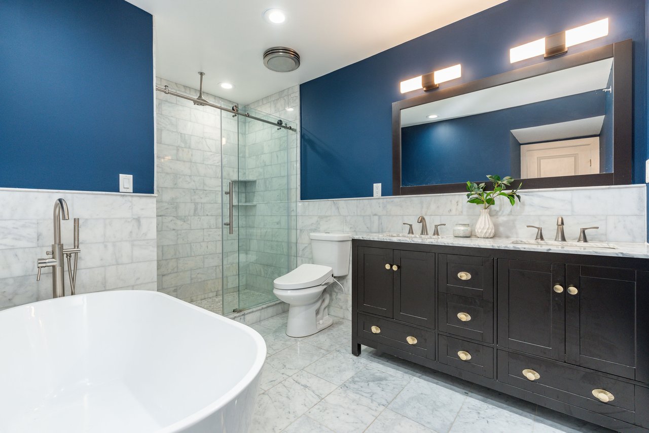 The third floor is dedicated to a truly exceptional primary suite—designed as a private retreat that feels both expansive and serene. The bedroom is remarkable in scale, with oversized windows framing treetop views and filling the space with natural light throughout the day. A thoughtfully integrated wet bar enhances the experience, offering convenience for both morning routines and evening wind-downs. The en-suite bathroom is finished with timeless materials, featuring a soaking tub, glass-enclosed shower, and double vanity. A large walk-in closet provides exceptional storage.