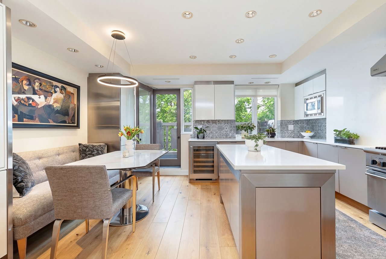 The entry level is both functional and elegant, featuring wide-plank oak floors and tray ceilings. A custom wet bar with Sub-Zero refrigeration and a Bosch dishwasher is seamlessly integrated into the foyer—an unexpected yet highly practical touch for entertaining. A discreet mudroom and powder room maintain the home’s clean aesthetic. The main living area is anchored by a gas fireplace and opens through oversized French doors to a serene, enclosed rear patio. This private outdoor space and garden allow for entertaining and connects directly to the gated parking courtyard, offering rare tranquility with no rear road exposure.