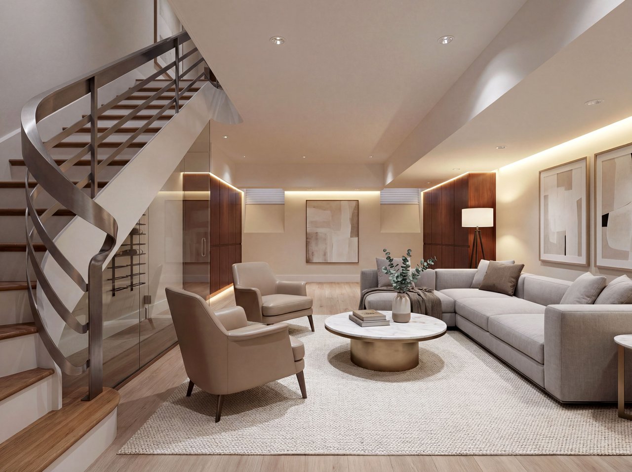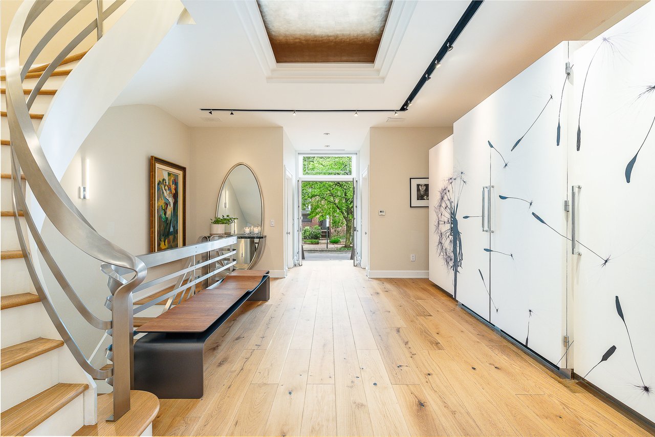 Inside, a sweeping sculptural staircase serves as the home’s architectural centerpiece, gracefully connecting all five levels. Its curved design, wood treads, and custom metal railing create a striking visual statement, while a dramatic circular skylight above fills the space with natural light throughout the day.