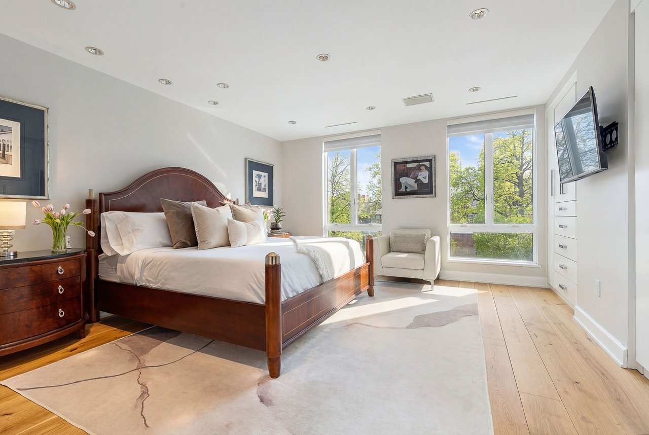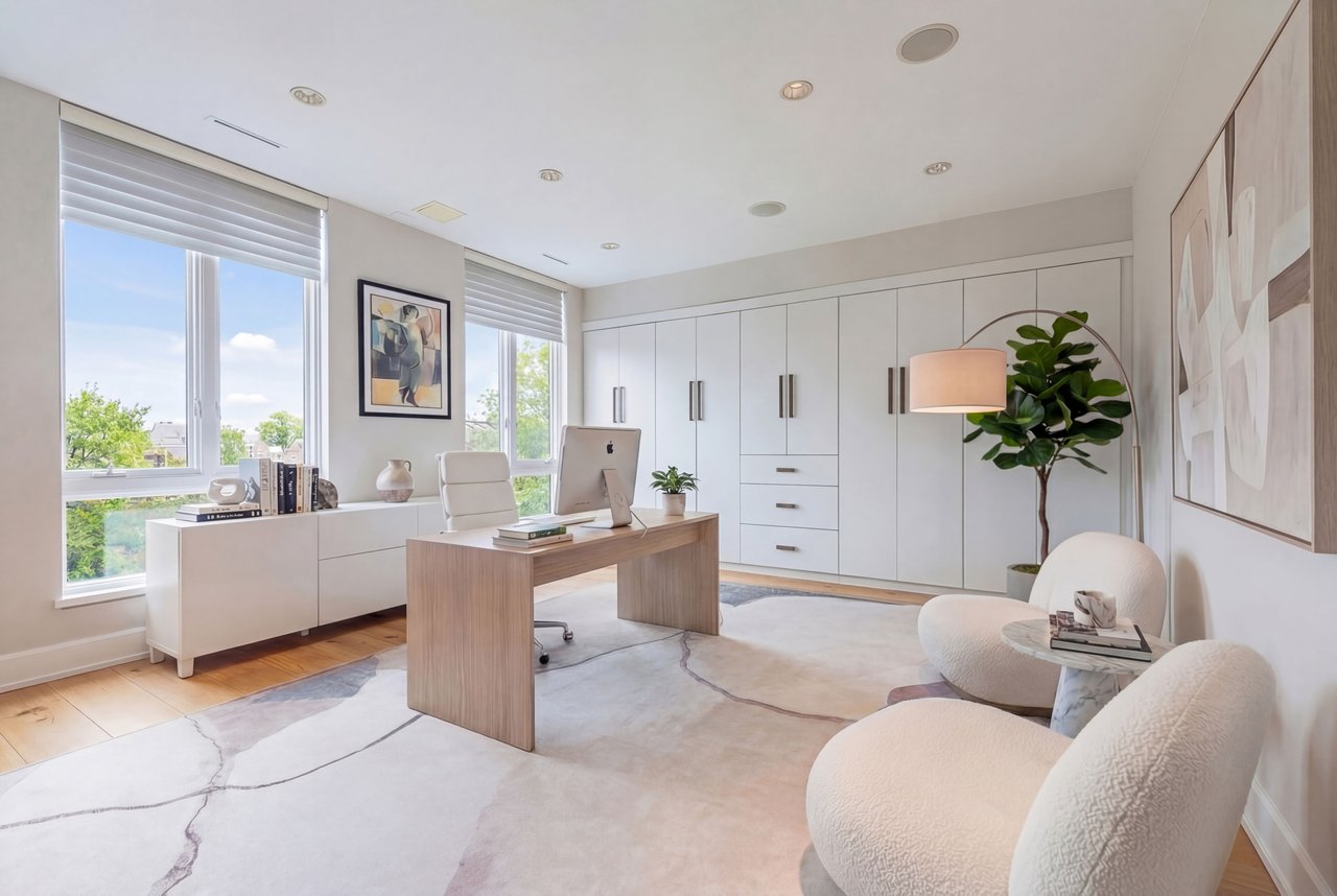 The upper levels are designed with privacy and flexibility in mind. The primary suite, located at the rear, enjoys warm western light and a peaceful, retreat-like setting. Generously scaled, it features custom-fitted closets and a beautifully appointed ensuite bath with premium finishes, including a Toto Neorest 700H smart toilet. A secondary bedroom at the front of the home benefits from soft morning light and offers versatility as a guest suite, office, or additional living space. Bathrooms throughout the home have been thoughtfully upgraded with a focus on both design and performance.