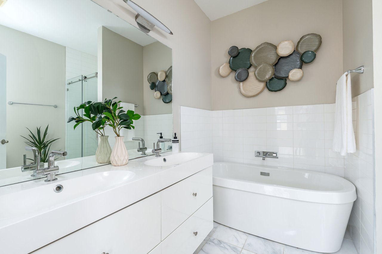 Upstairs, two spacious bedroom suites each offer their own en suite bathrooms. The primary suite is a true retreat, framed by two sets of bay windows that flood the space with natural light. Generous in scale, it offers excellent closet space and a beautifully appointed bathroom with crisp white tile, a double vanity, soaking tub, and a glass-enclosed shower. Laundry is conveniently located on this level.