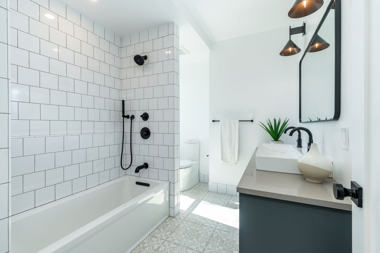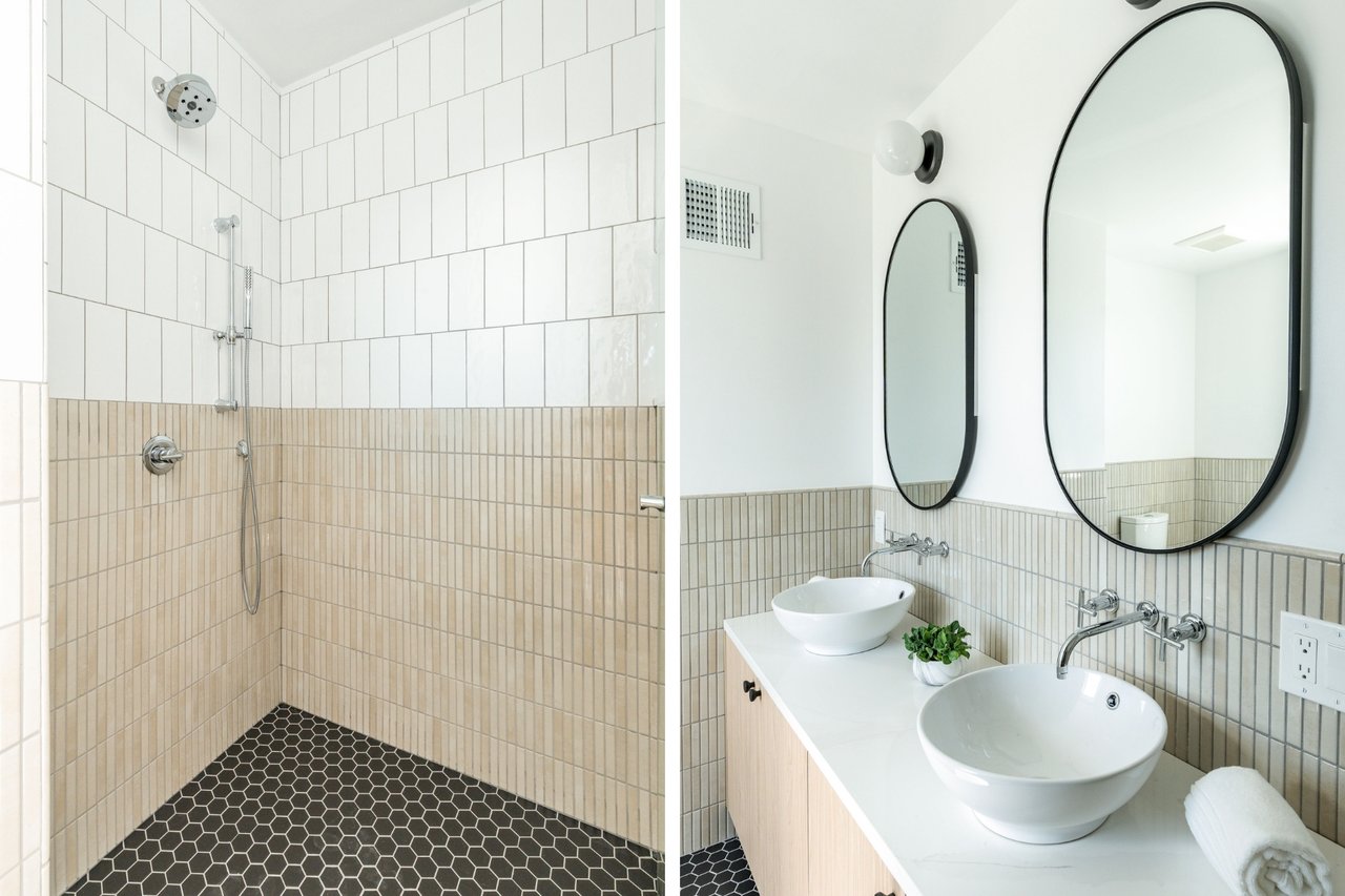 Upstairs, two sun-splashed bedrooms feature deep-set windows and hardwoods; the hall bath blends encaustic-style patterned tile, a white-subway tub/shower with niche, matte-black fixtures (including handheld), and a floating stone-topped vanity. A dedicated laundry room adds uppers, a butcher-block folding counter, deep utility sink, and LG gas washer/dryer. The top-floor primary suite feels boutique with two closets, a ceiling fan, mini-split zoned comfort, and a spa bath with twin vessel sinks, wall-mounted faucets, oval black-rim mirrors, vertical kit-kat tile wainscot, and a walk-in shower finished in vertical white tile over warm-taupe ribbed tile with a charcoal hex-mosaic floor. A finished lower level provides flexible bonus space plus utility/storage.