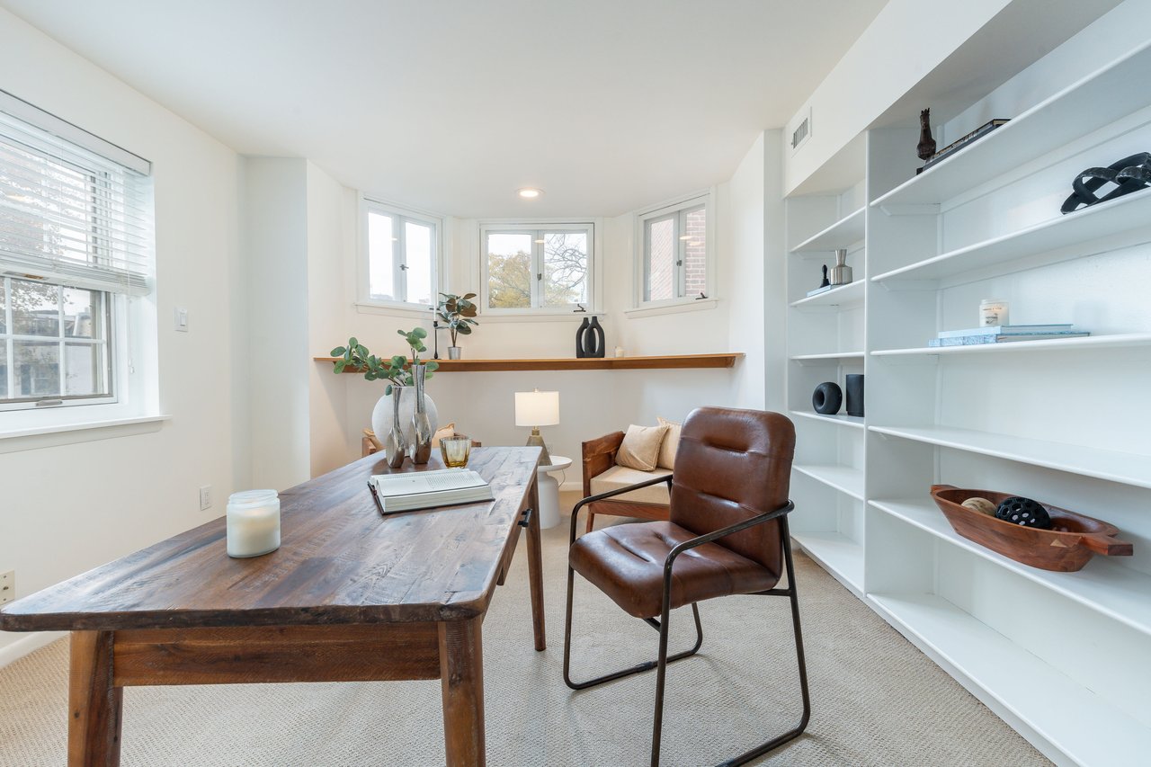 The third floor features a spacious home office or den at the rear, framed by a bay of windows that invite abundant natural light. This level also includes a custom walk-in wardrobe and a large laundry suite with full-size washer and dryer and a working cedar sauna—a true luxury rarely found in historic homes. At the front, two additional bedrooms overlooking Delancey Place share a well-appointed full bath. The top floor offers two more sun-filled bedrooms sharing a hall bath with views over Delancey, while the lower level provides exceptional ceiling height and versatility—ideal for a gym, studio, or wine cellar.