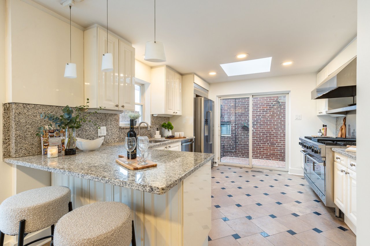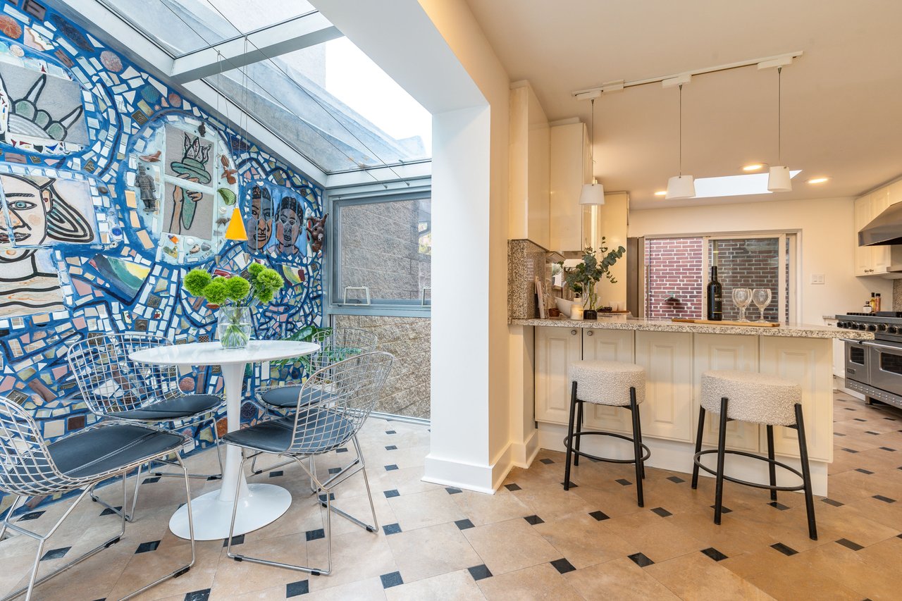 The eat-in kitchen balances artistry and function with a six-burner Viking range, stone countertops, expansive island, and twin skylights that flood the space with brightness. A custom mosaic wall mural by renowned Philadelphia artist Isaiah Zagar adds a bold creative signature, while sliding glass doors open to a brick patio and the attached two-car garage—a rare luxury in Center City—accessible from wide, quiet Cypress Street.