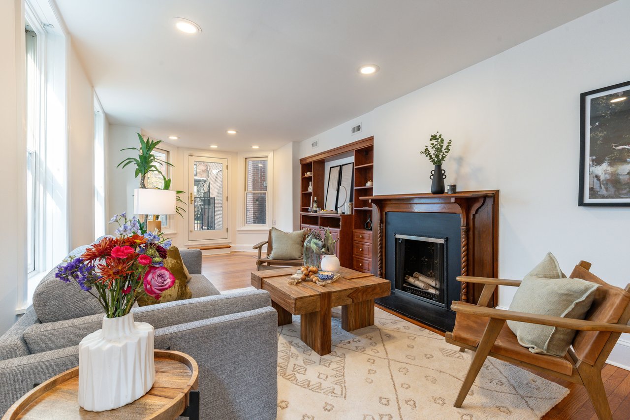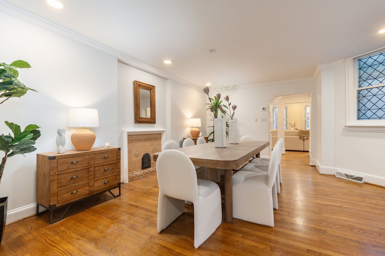 Set on the sunlit north side of the block, the home enjoys southern, western, and northern exposures, filling each level with natural light. A traditional vestibule opens into a gracious formal living room, where soaring ceilings, intricate crown moldings, and a fireplace framed by a custom Tigerwood mantle handcrafted by Pappajohn Woodworking create an elegant welcome. Just beyond, the formal dining room glows with original leaded-glass windows that filter soft, dappled light.